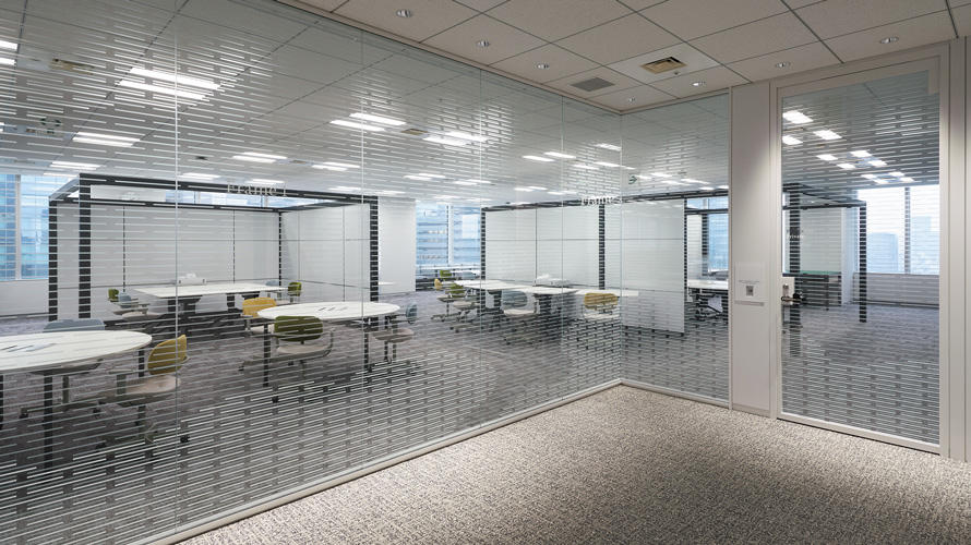 各所のガラス壁にグラフィックスを施した「霞硝子」。伝統的なすやり霞のかたちをトレースした形状でありながら、それをビット信号のような単線の集合で表現し、表裏の重なりや濃度を変えることによって、エリアの秘匿性に合わせて透過度をコントロールする。