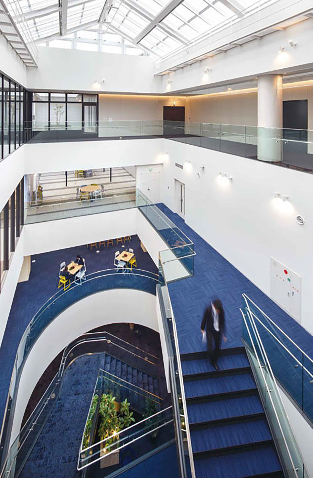 高セキュリティ部門が入居。吹き抜けに面するガラスからつながりを意識できる。