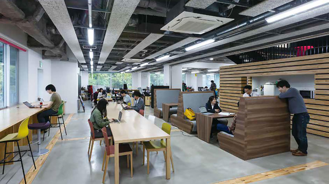 産学連携のラボスペースに設けた共用スペース。学生・教員・企業が交わる空間。