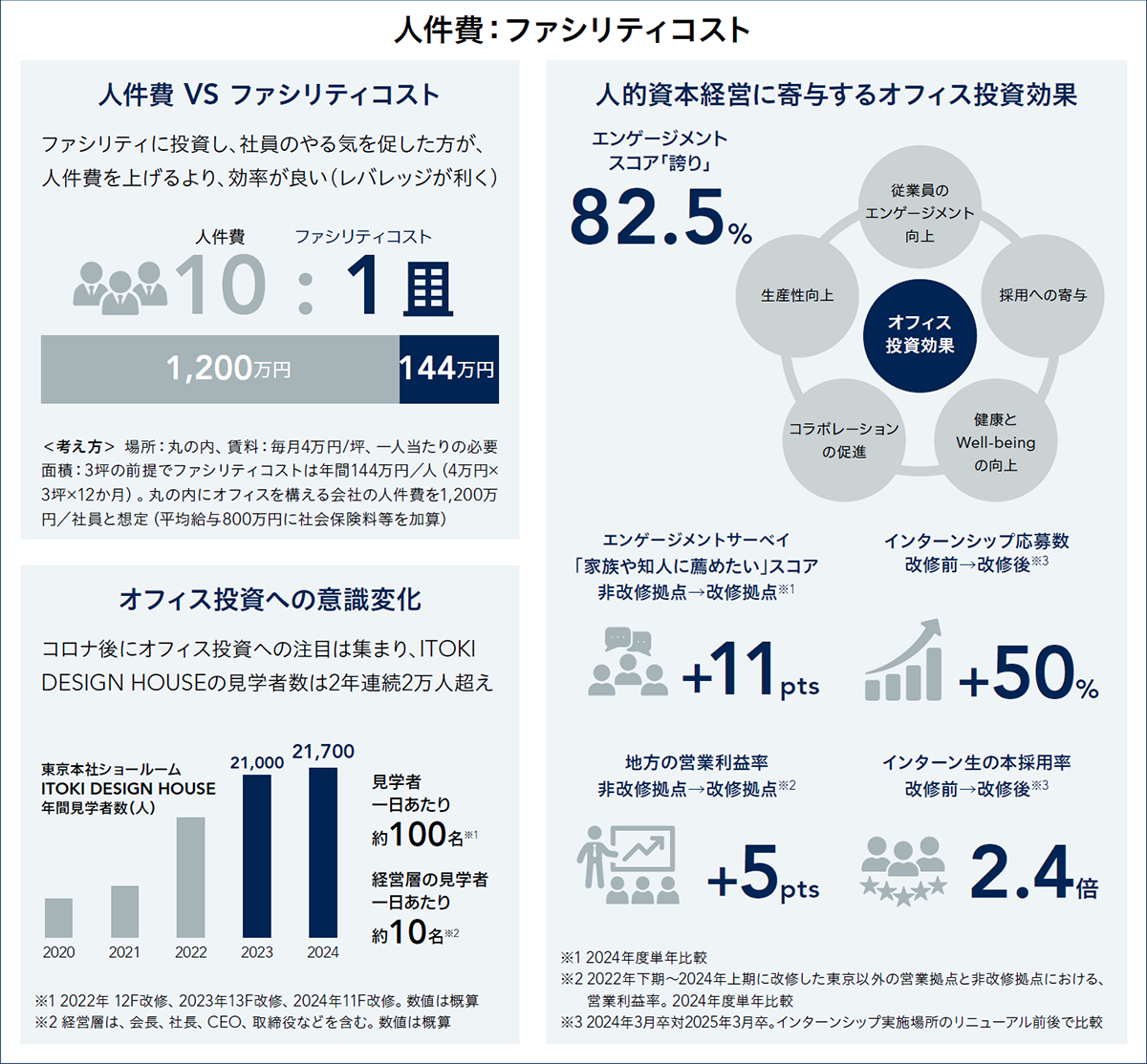 コロナの収束に伴い、在宅勤務に慣れた社員が再び出社したくなるオフィスのあり方を経営者が真剣に考えるようになり、直近では、オフィスは生産性を上げるための設備機能として、コストではなく「人的資本への投資」と捉える流れが一気にきています。