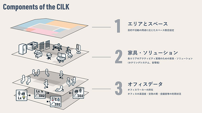 新京橋オフィス「CILK」は、「エリア&スペース」「家具・ソリューション」「オフィスデータ」の3つの要素をミックスし、空間をデザインしています。