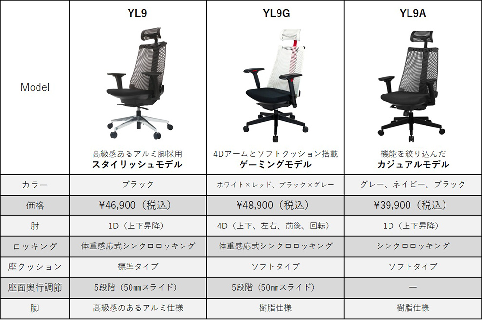 - 2021年4月:ゲーミングモデル「YL9G」を発売。アームレストの機能を強化し、ソフトクッションを搭載することで長時間使用にも対応。