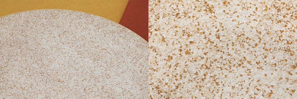 本素材は、卵殻を粉砕したものを意匠として活かすため、透明な樹脂でコーティングし、立体的な質感をもたせた点が特徴です。