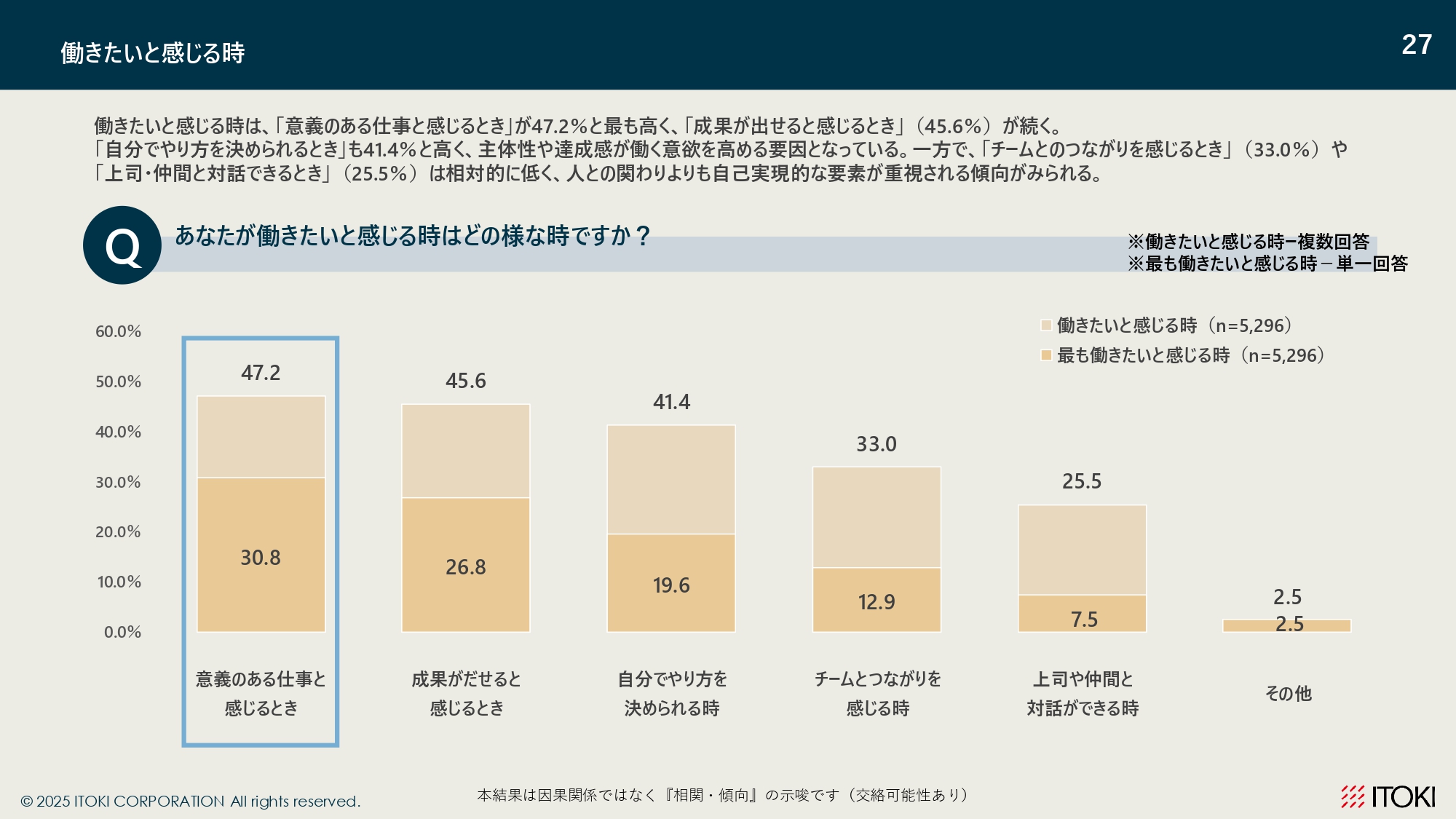 20代では「チームとつながりを感じる時」「上司・同僚との人間関係」の人間関係が働きやすさの土台として強く意識され、30代では「自律的に動ける時」といった裁量の大きさが他の年代と比べて最も大きな割合となりました。40代では「成果が出せる実感」が全世代の中でも特に重要視され、50代では成果に加え「意義のある仕事である実感」が働きたい気持ちを支える主要因となりました。
