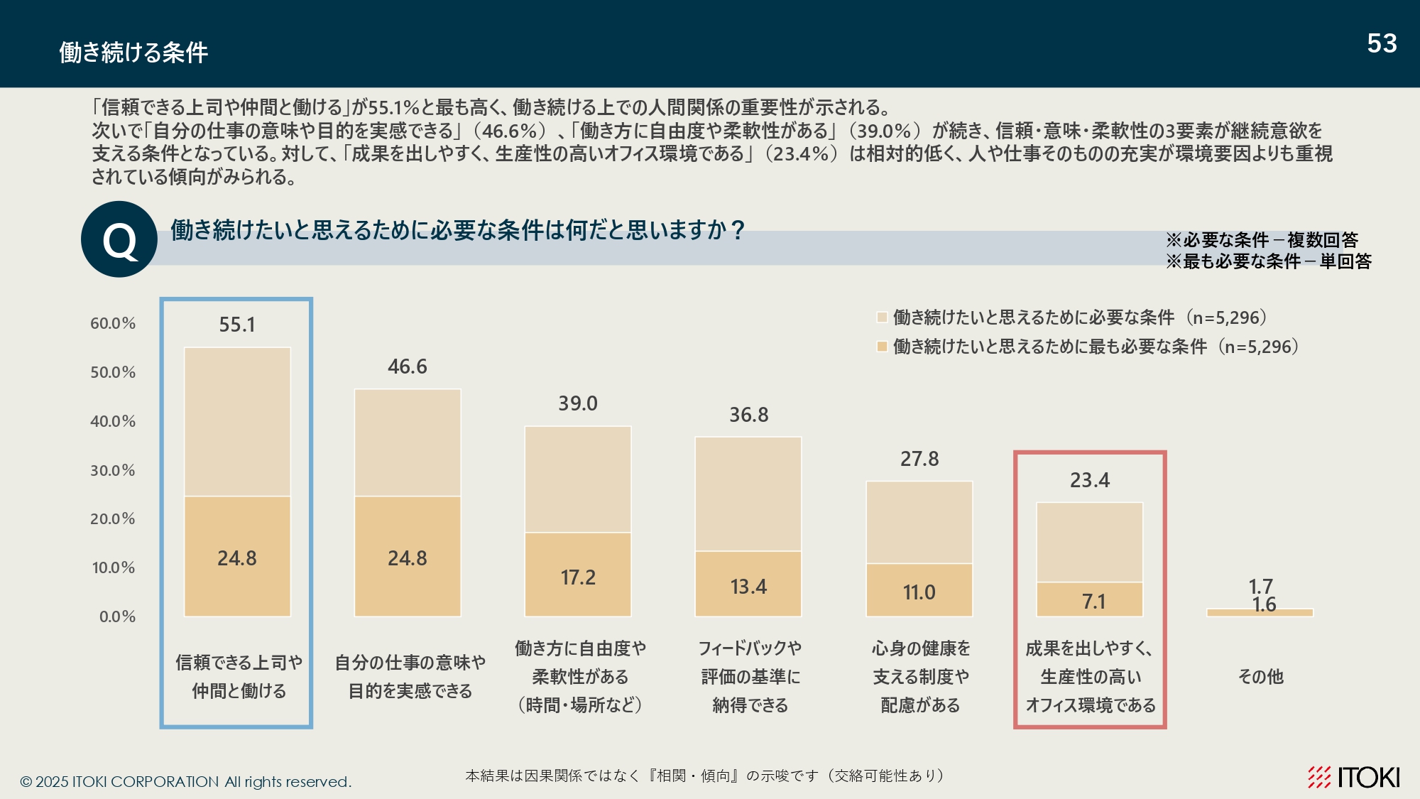 これらを総合すると、帰属意識は「給与・待遇」だけではなく、「関係性」と「環境」の三軸で高まりやすい構造がうかがえます。とくにオフィス環境は心理的な安心感や働きやすさと結びつき、長期的な定着を下支えする要素として機能していると考えられます。