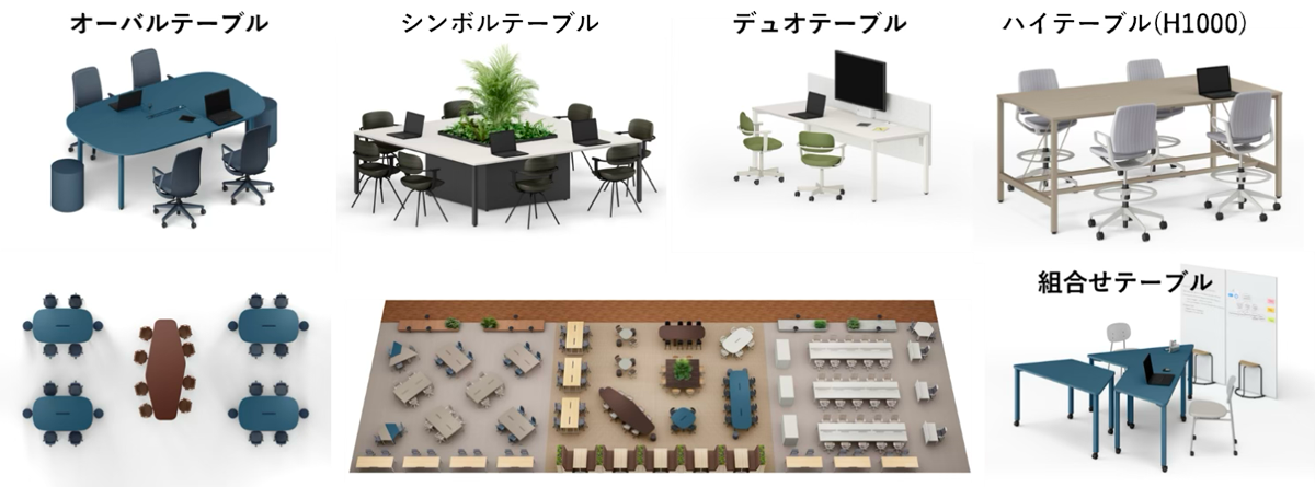 ランダムな動線の創出とチームワークにも適した執務席のオーバルテーブル、止まり木スペースとして使いやすいシンボルテーブル、2人で相談しながら作業しやすいデュオテーブル、コミュニケーションが生まれやすいハイポジションワークスタイルに適したハイテーブル、フレキシブルに組替しやすい組合せテーブルの他、サイズも新たに追加しています。