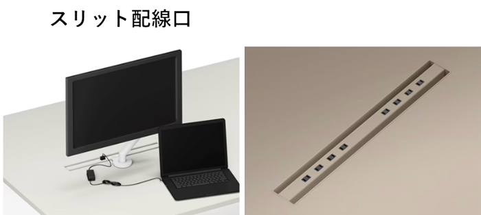 ワークテーブルにはスリット配線口タイプも追加します。横長の細長い形状の配線スリットは、机上面を広く使うことが可能で、モニターを自由な位置にクランプ出来る形状となっており、個人執務をより快適に行うことができます。