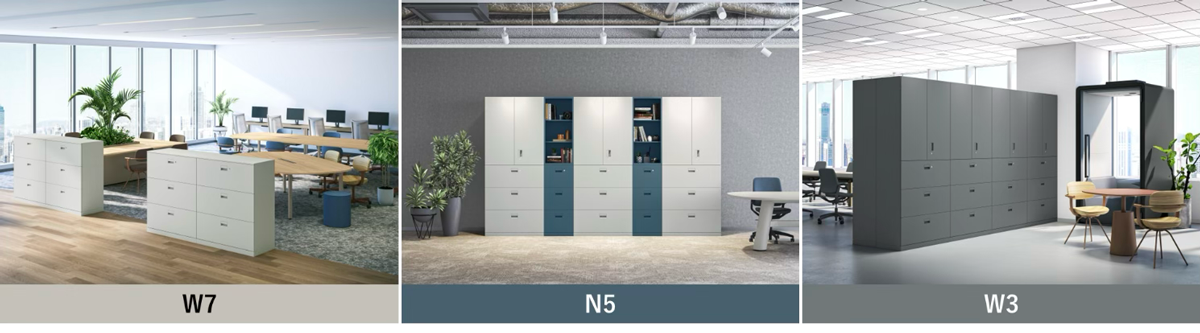執務エリアの収納については、エスキャビネットにカラーを追加します。メインカラーW7(サテンホワイトグレーW)色を追加するほか、アクセントカラーとしてN5(サテンティールブルー)、壁面になじむ低明度カラーとしてW3(ダークグレーW)を追加。全面サテン調の仕上げとなっています。