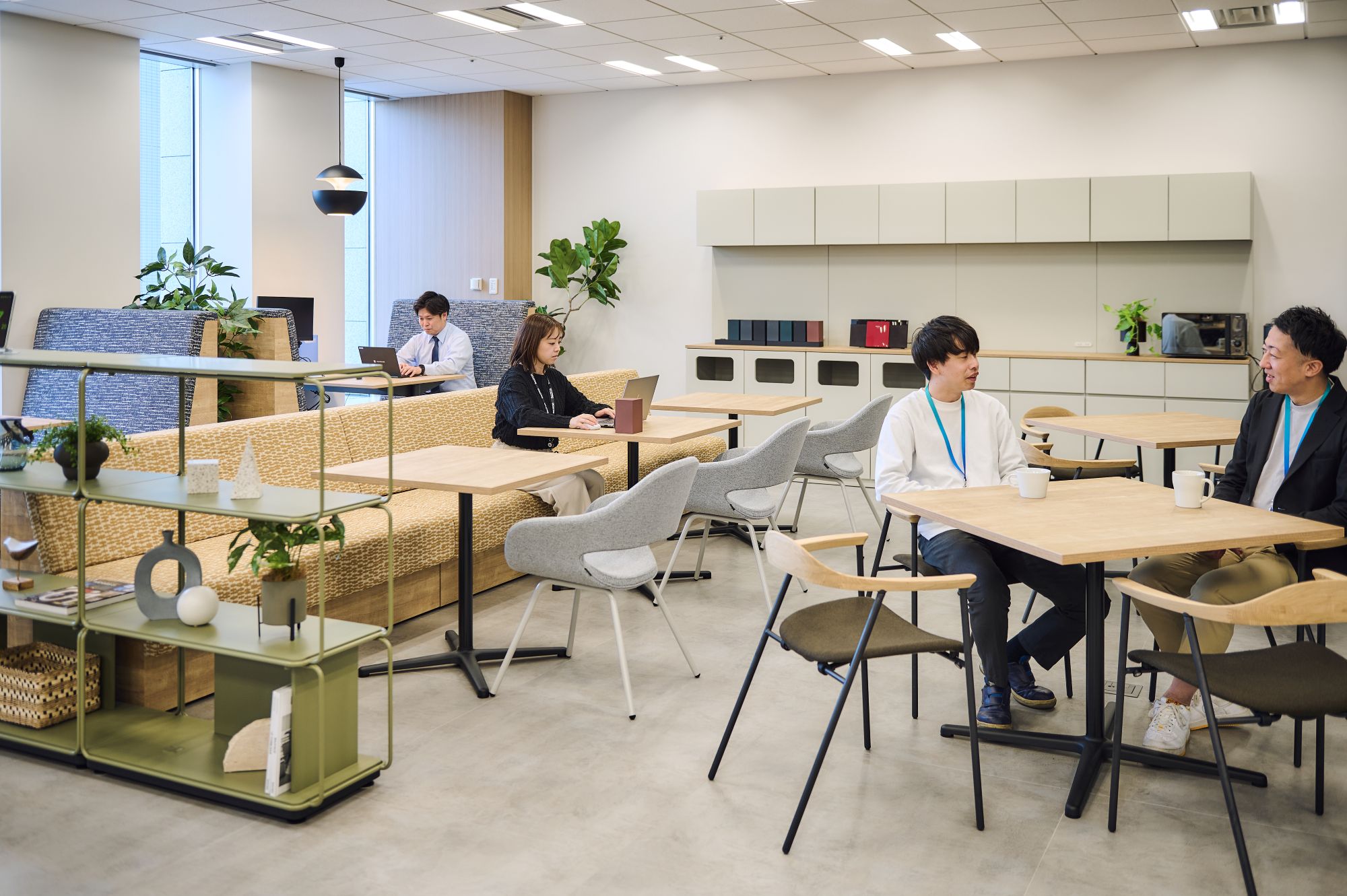 1人でも複数人でも使いやすいロングソファや4人テーブルを配置。打ち合わせやランチにも活用できるカジュアルな空間です。仕事の合間に気分を切り替え、偶発的なコミュニケーションから新たなアイデアが生まれる場となっています。