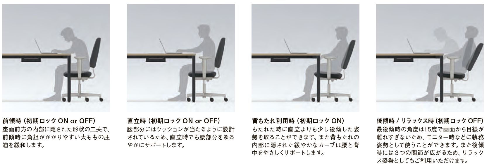 くるぶしを支点に背と座が連動して傾く「アンクルムーブ・シンクロロッキング」