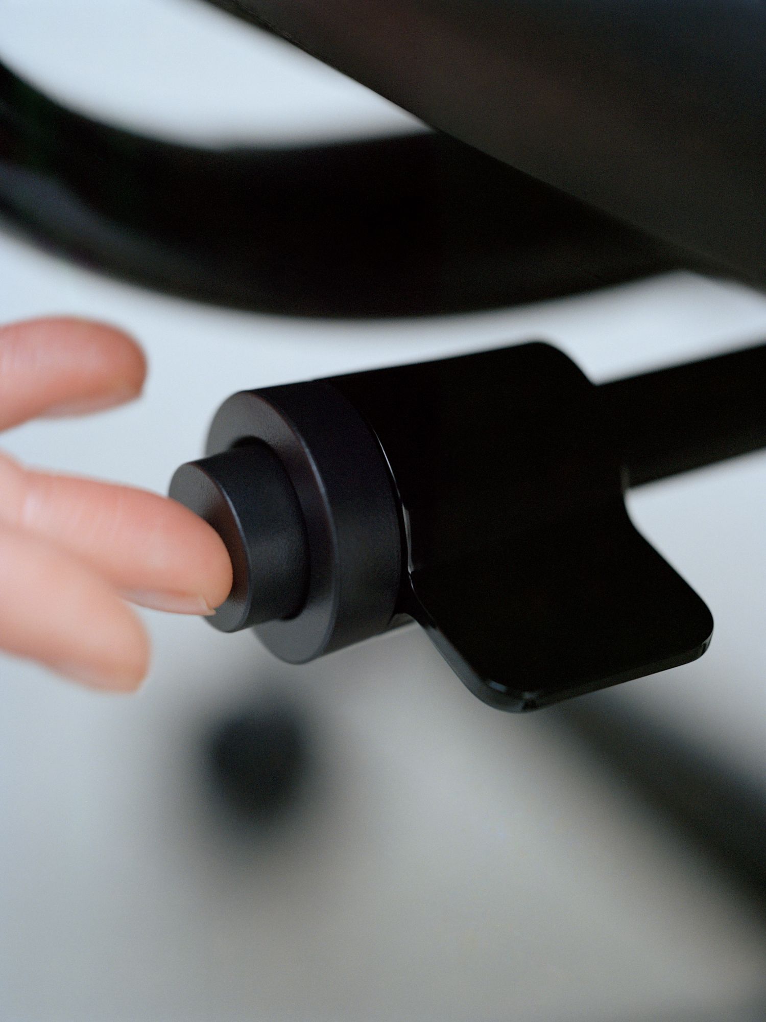 座面下の操作レバーを1本化し、昇降や背固定をシンプルに行える構造を採用。レバー先端のプッシュ式ボタンで背もたれの初期角度を固定でき、昇降脚タイプは、羽根つきレバー部分を回転させることで座面の高さを調整できます。(90mm範囲)