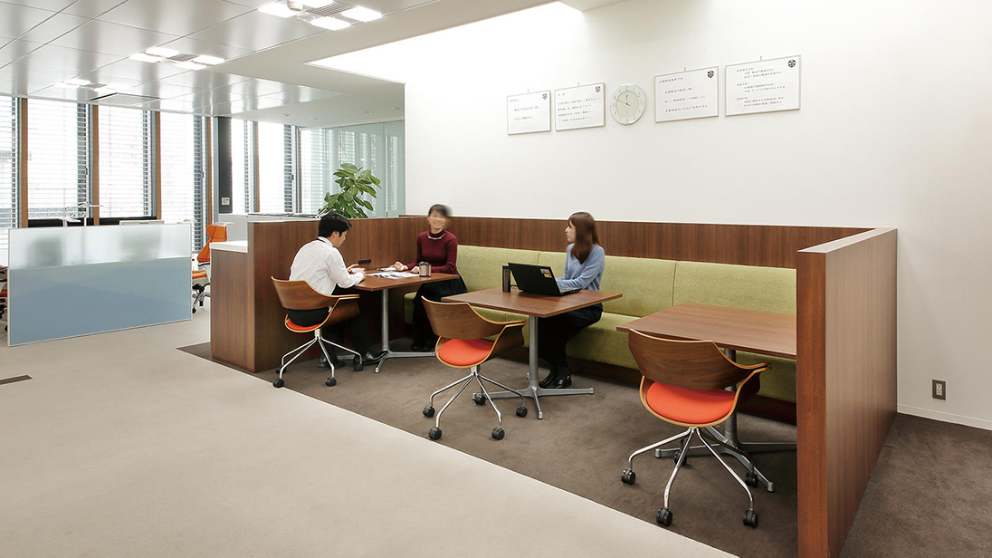 A space adjacent to the entrance that can be used for office work and informal communication. There is a top light at the top, allowing natural light to pour in. It can also be used as a touchdown desk for employees at other locations.