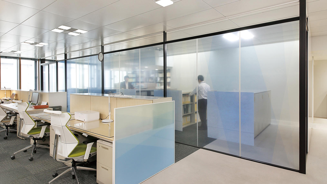 Panoramic view of the office. Across the main flow line in the center, to the right is the communication area, to the left is the desk work area, and at the far end is the filing area. Automatically controlled blinds let in optimal natural light, creating a bright atmosphere in the office.