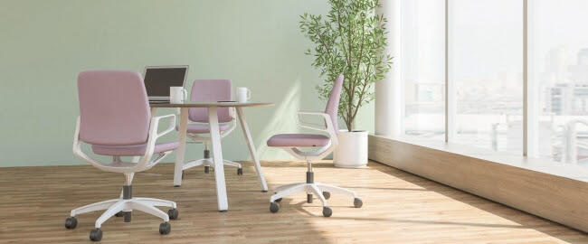 "Levi" is a light task chair that offers a very soft seating comfort without adjustment, despite its simple design. The innovative functions inside the backrest and seat are hidden from view, allowing it to fit a wide range of usage scenarios, from a leaning forward posture when working at a desk to a relaxed posture when using a mobile device. It also comes in a wide variety of body colors and textiles, making it easy to match with a variety of spaces.
