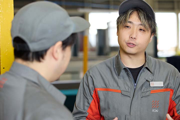 上司と部下であり、兄弟でもある二人が担当しているのは、キャビネットの一部となる部材のプレス加工。マシンの細かな調整や、工程設計の最適化と日々向き合っている。そんな二人の情熱は業務だけに留まらず、製造現場の課題改善を目的とした社内コンペにも注がれている。互いに負けまいと創意工夫を競い合い、時には協力することで、これまでに多くのアイデアが生み出された。常に切磋琢磨し続ける彼らの成長に終わりはない。