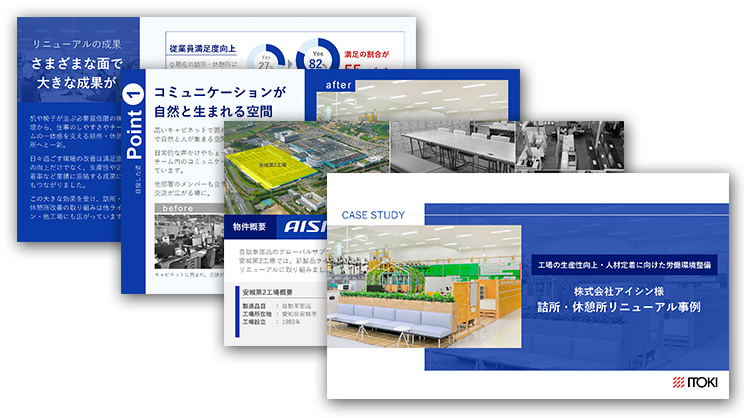 本資料では、詰所・休憩所のリニューアルに至った背景から、具体的な改善ポイント、ビフォーアフター、そして従業員満足度が3倍以上に向上した成果まで、以下の内容をくわしくご紹介しています。