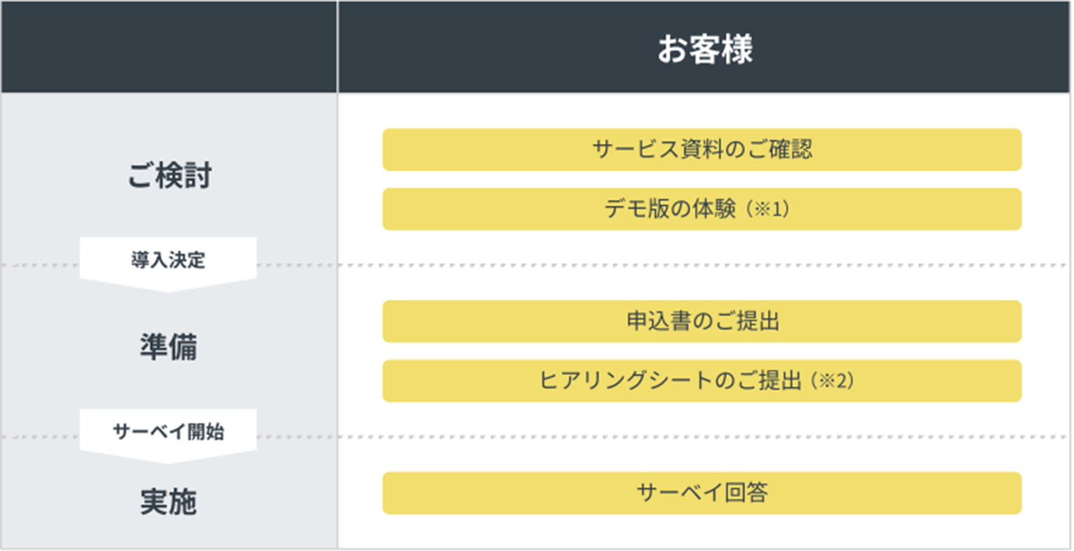 - ※2 サーベイ実施に必要なお客様情報をご入力の上送付いただき、弊社で設定を行います。