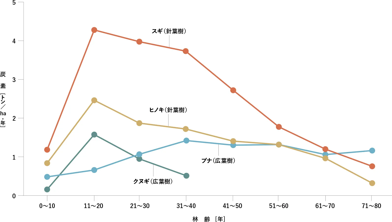 さらに、森林の機能のひとつである温暖化防止という観点からも、適切な木の伐採は必要です。木は大気中から二酸化炭素を吸収し、その内部に炭素を固定する機能があります。図2のとおり、成長中の若い木は多くの二酸化炭素を吸収しますが、高齢化した木では二酸化炭素の吸収量が減っていきます。つまり、伐採適齢期に達した木はどんどん伐採し、新しい木を育てていかないと、森林による炭素の固定量が減少してしまうのです。