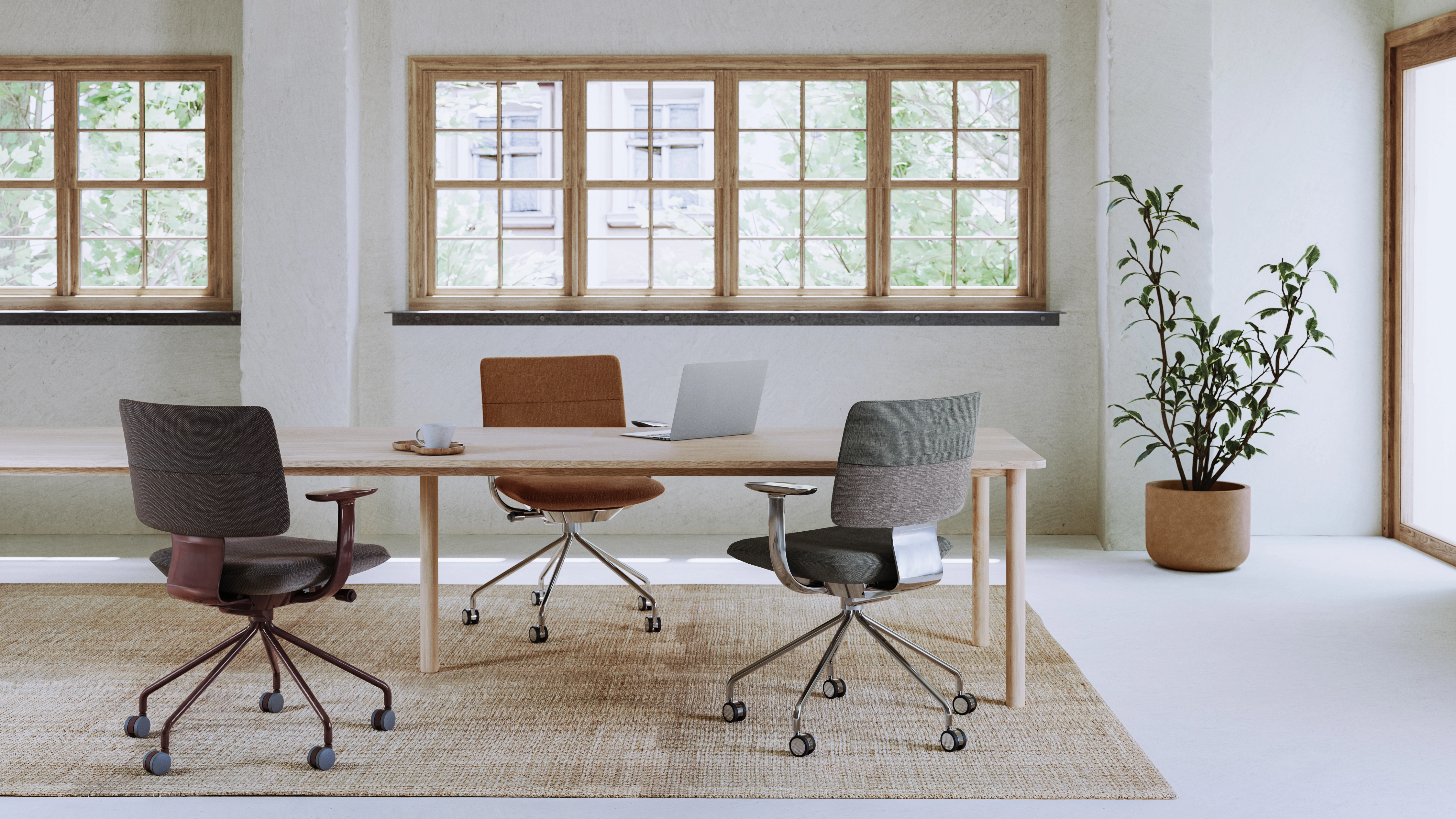 豊かなバリエーションもSHIGAの特徴のひとつです。オフィスのデザインに合わせて選べる7タイプの本体仕様に加え、張地は洗練された印象の単色(8色)や軽やかなツートーン(7色)から選べるオリジナルファブリック、北欧を代表するテキスタイルブランド〈Kvadrat〉社のファブリック(3色)、上質な雰囲気をもつ本革(2色)と、多彩なバリエーションをご用意しています。また、フレームの仕上げにはサテン塗装(3色)、アルミミラー、グロス塗装(3色)の3種類を採用。それぞれの素材が持つ質感、そして上質で落ち着いたカラーリングが、毎日座っても「心地よい」と思えるチェアを生み出すのです。